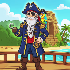 A swashbuckling airplane styled like a pirate ship, complete with a skull and crossbones flag and treasure maps.
