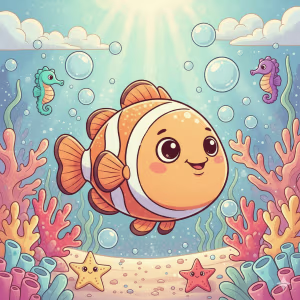 Hangyodon happily swimming with his fish friends in a colorful ocean.